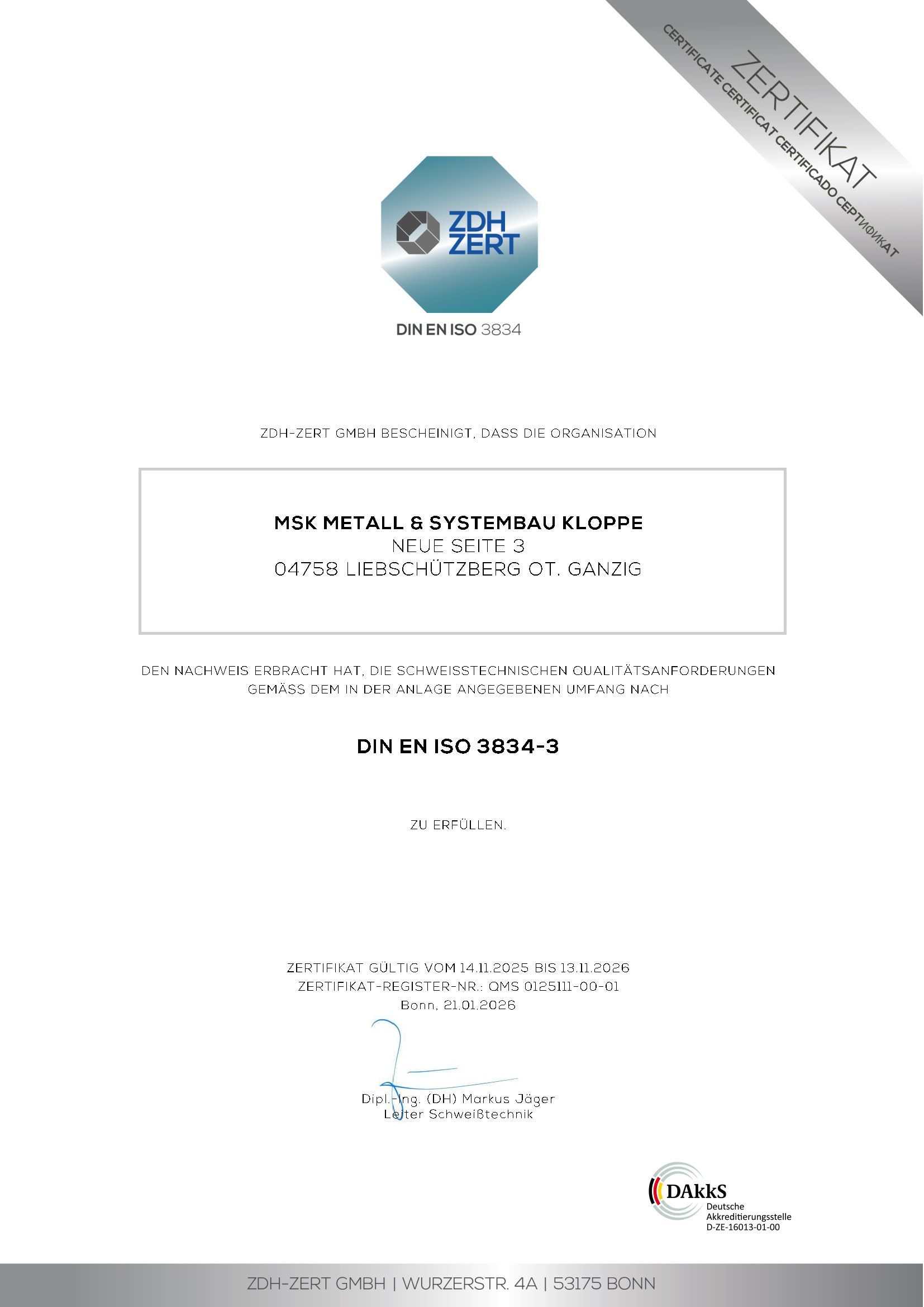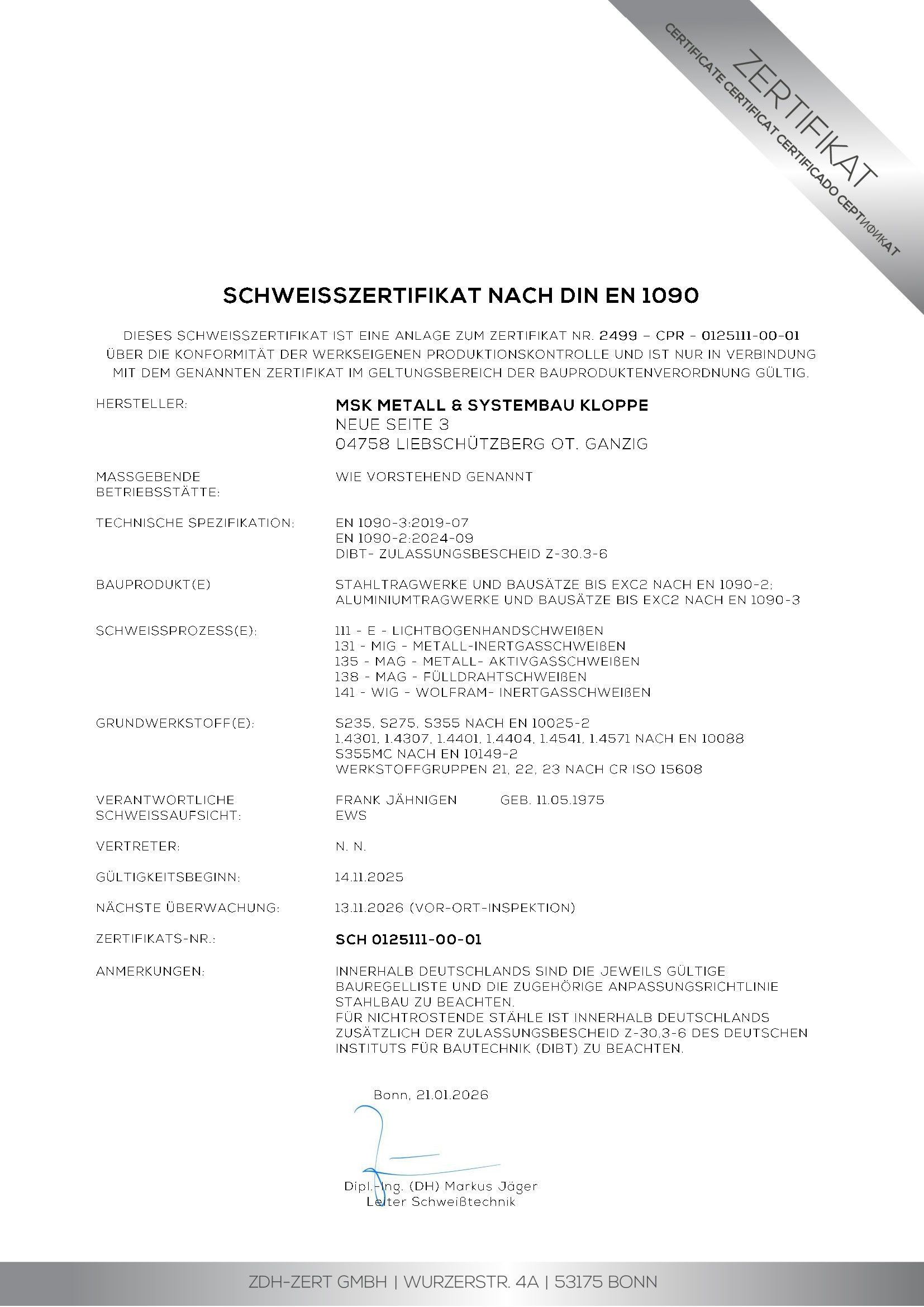 Dabei arbeiten wir nach höchsten Qualitätsstandards und sind zertifiziert nach DIN EN 1090-1 sowie DIN EN ISO 3834-3.